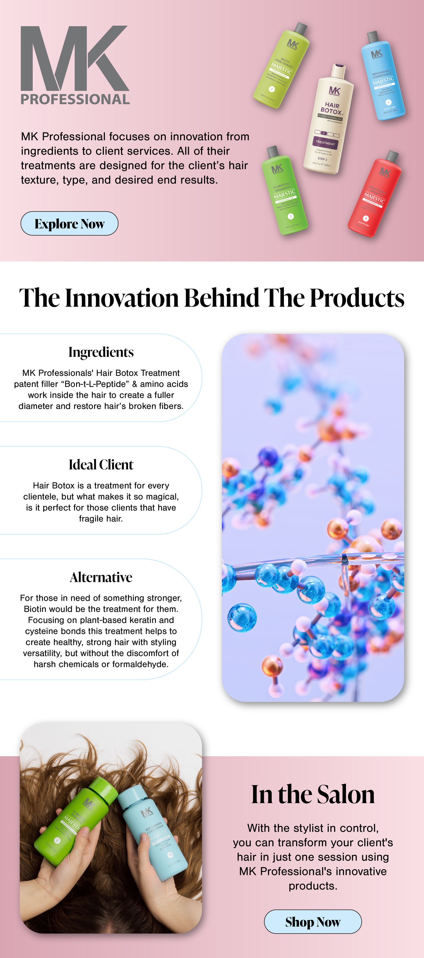 Hairstylists know that sometimes hair needs more than the daily care clients are willing to give it. Enter professional treatments. MK Professional, a haircare brand known for its innovative products and services tailored to all hair types and textures, has a wide variety of products that can help stylists treat their client’s hair concerns without compromising their strands—and that’s without using toxic ingredients like formaldehyde.