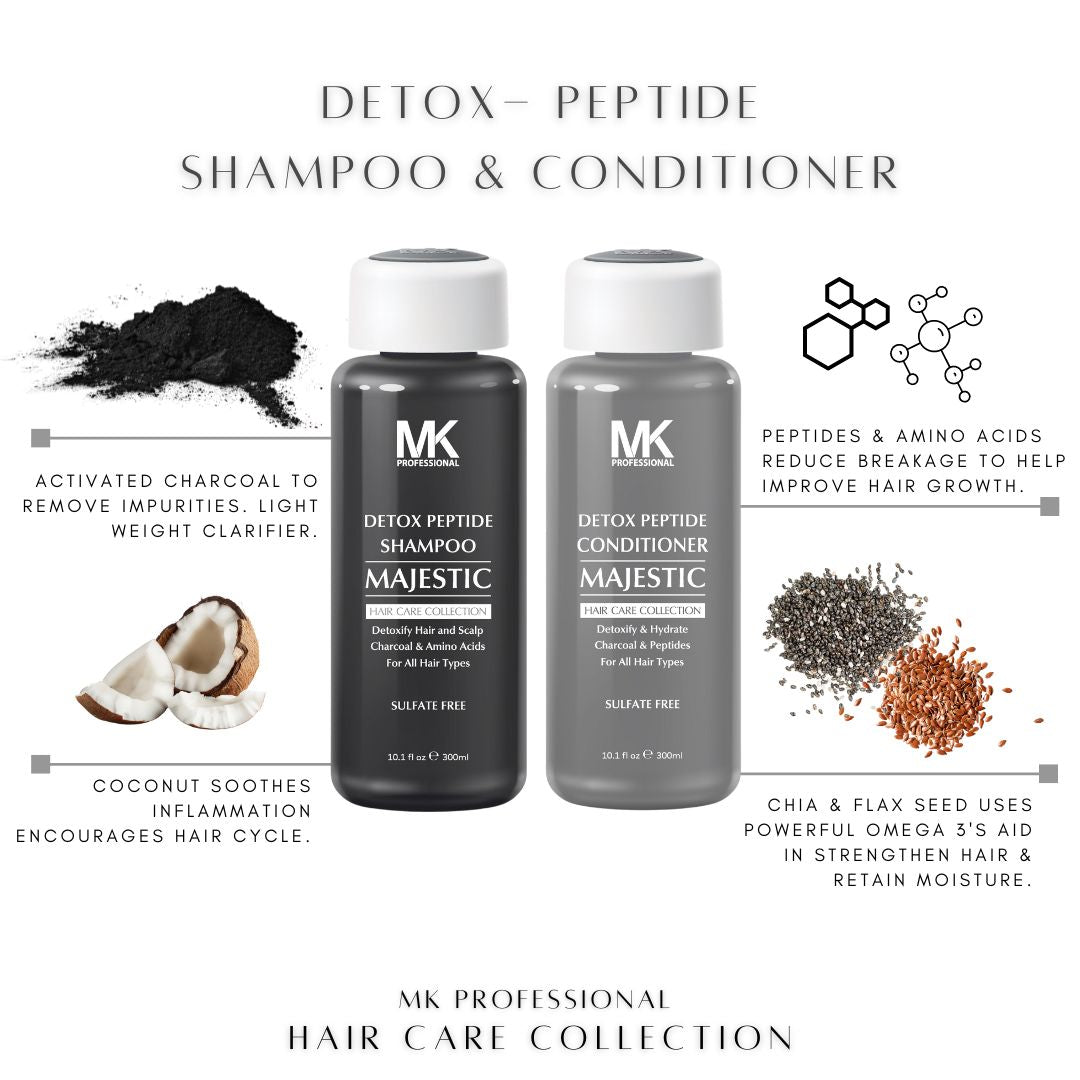 Majestic Detox Peptide Shampoo is formulated with Activated Charcoal, Chia Seed,Flax Seed, and Coconut Oil to help unclog hair follicles, and pores in the scalp.This revitalizing Shampoo balances hair while addressing multiple scalp concerns such as dryness, itchiness, and discomfort.