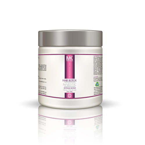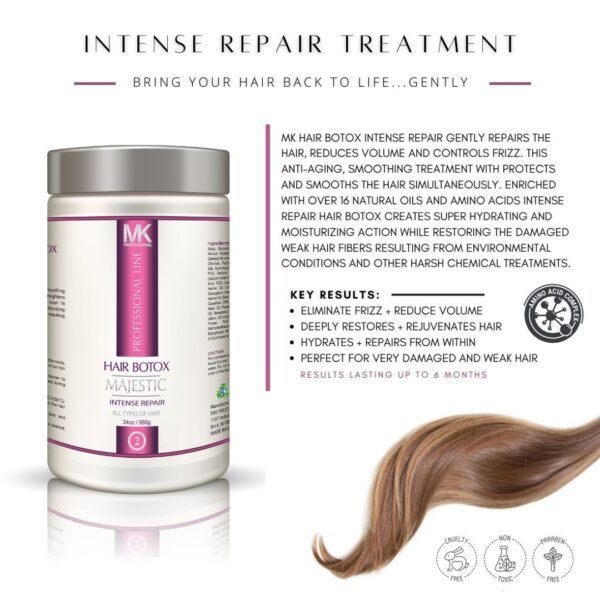 Bring your hair back to life, gently. MK Hair B.T.X INTENSE REPAIR gently repairs the hair, reduces volume and controls Frizz. This anti-aging, smoothing treatment with protects and smooths the hair simultaneously. enriched with over 16 natural oils and amino acids Intense Repair Hair B.T.X creates super hydrating and moisturizing action while restoring the damaged weak hair fibers resulting from environmental conditions and other harsh chemical treatments.