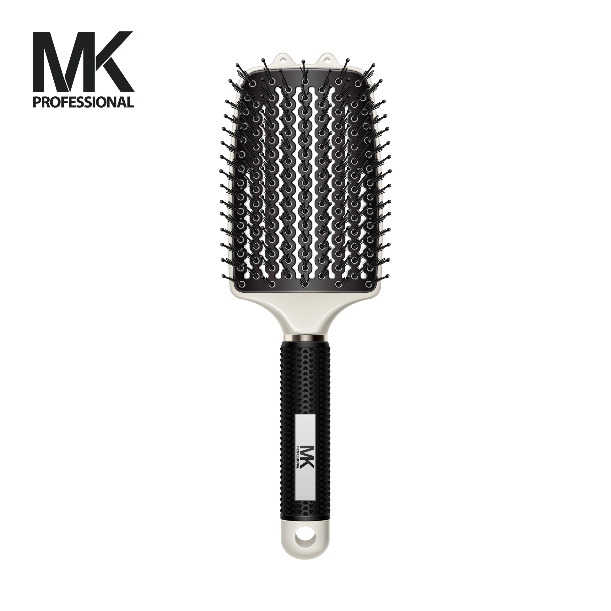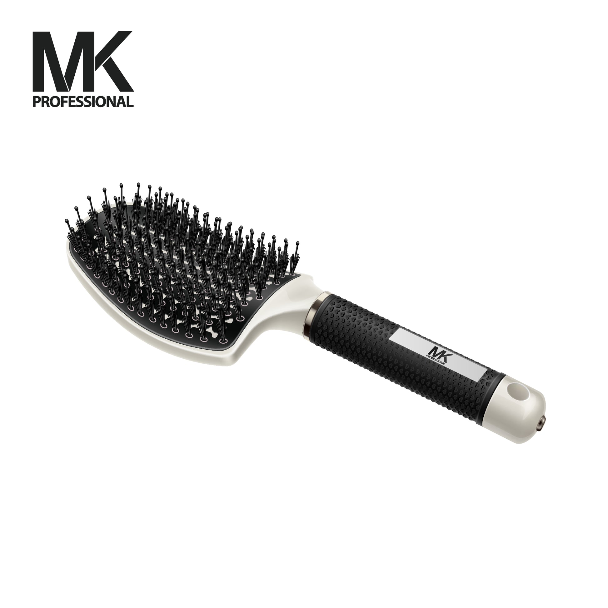 MK Nylon Boar Bristle Vent Brush working to gently stimulate the scalp while detangling the hair & additional shine. Creating effortless style with MK Nylon Boar Bristled Vent Brush: This double duty brush combine nylon & boar bristles working to gently stimulate the scalp while detangling the hair; using boar bristles to evenly distribute hair’s natural oils from roots to ends.